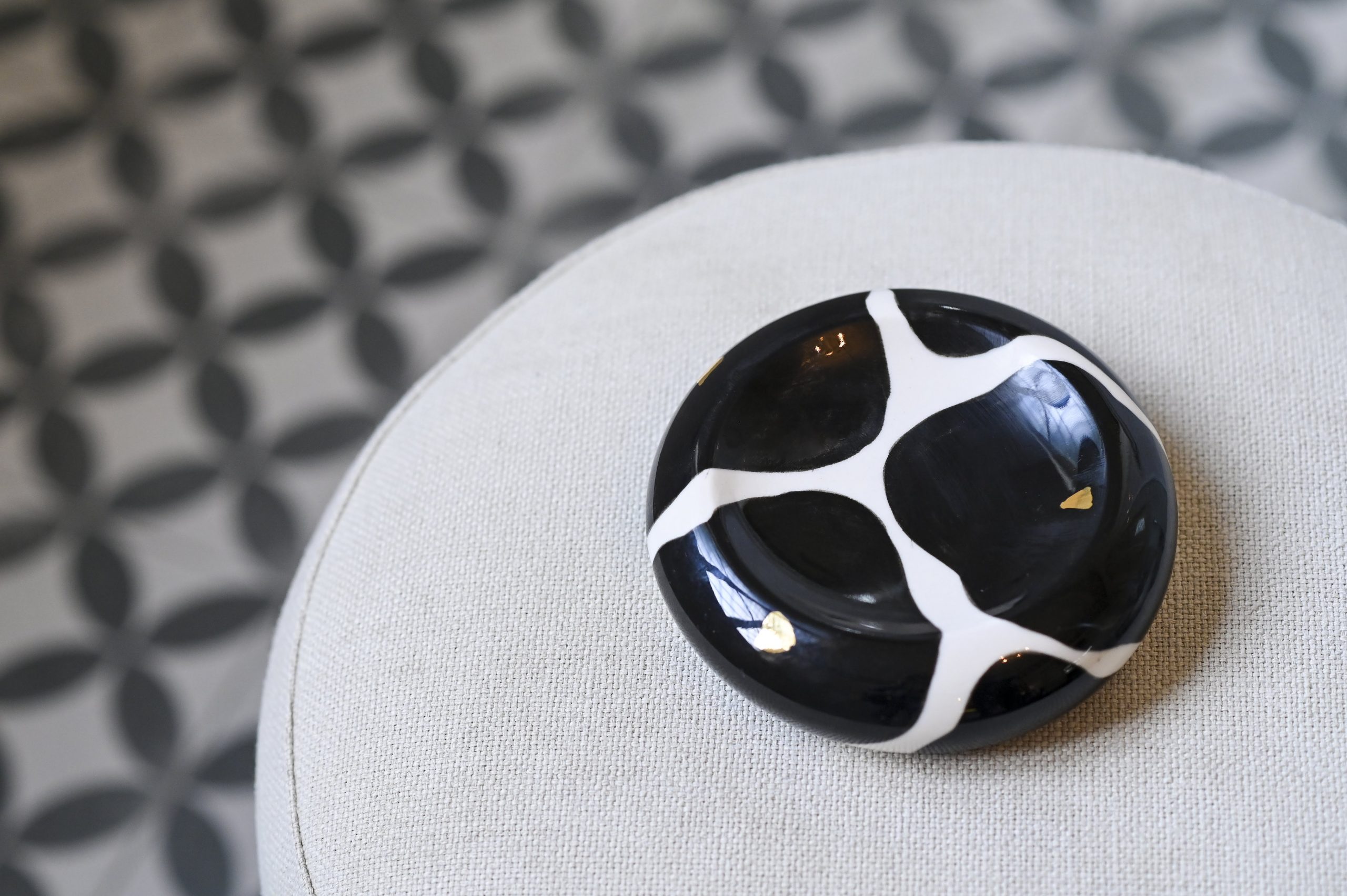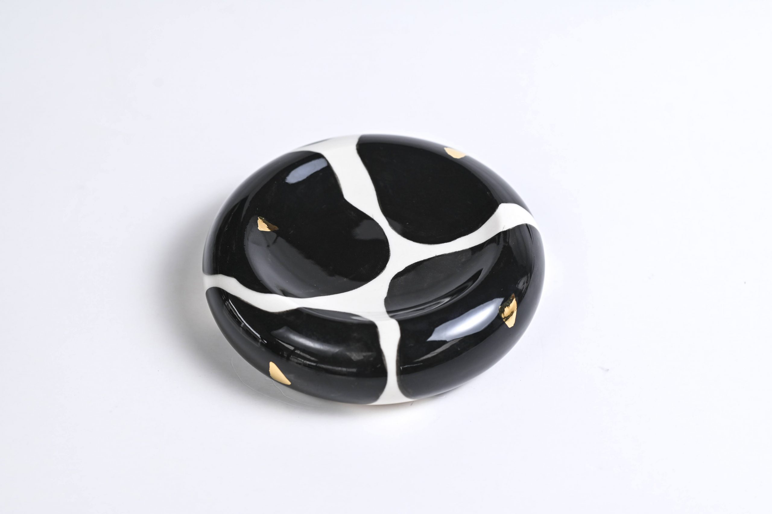 Hand-painted porcelain abstract flower pattern tray. with 22k gold highlights. Perfect wine coaster or catchall.