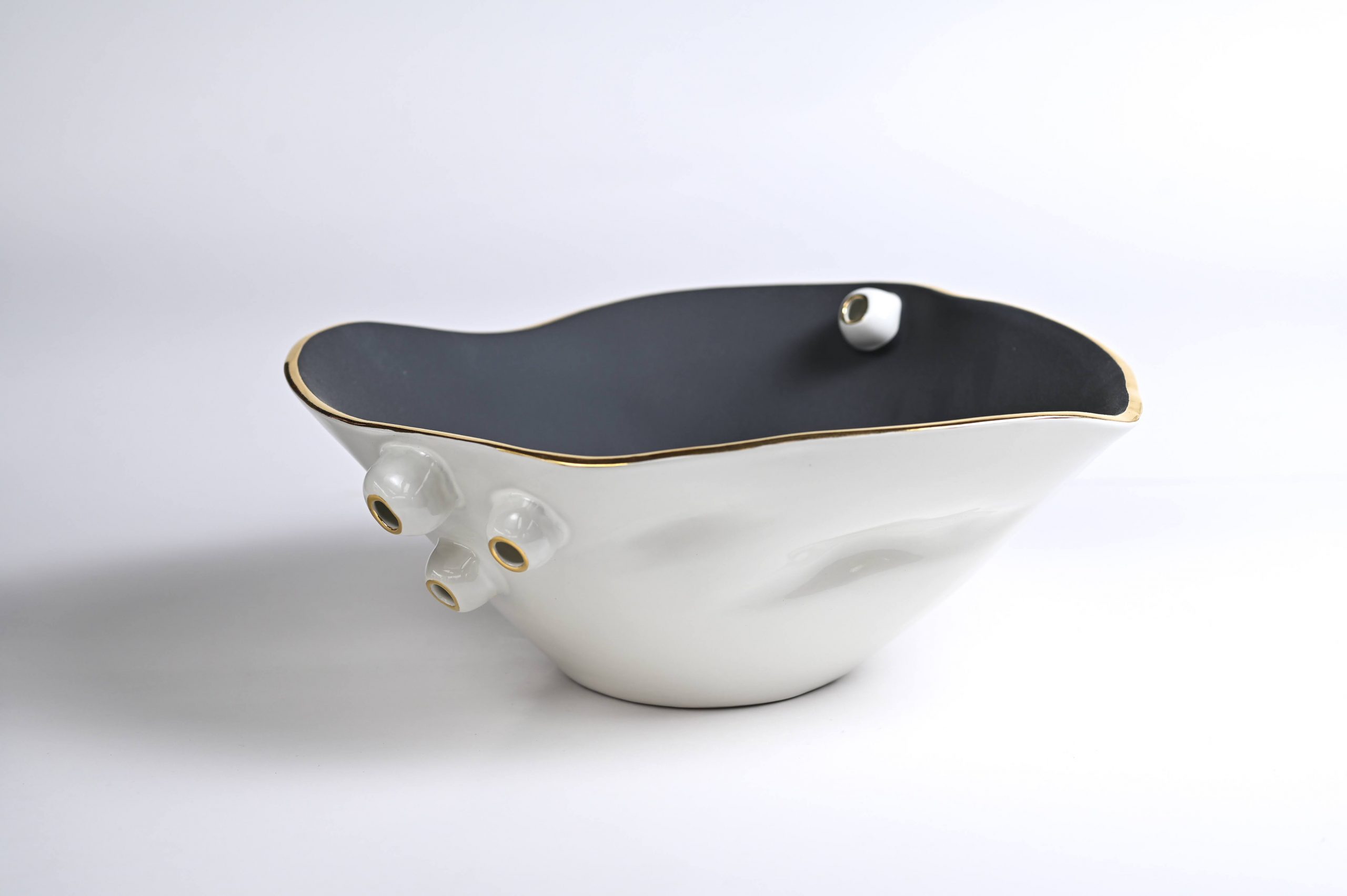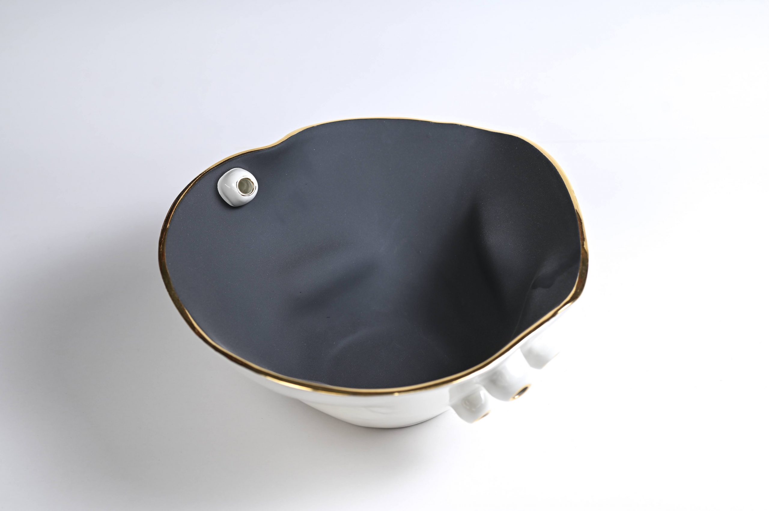 Handcrafted of signature ultra matte glazes on stoneware or porcelain with 22k gold details.