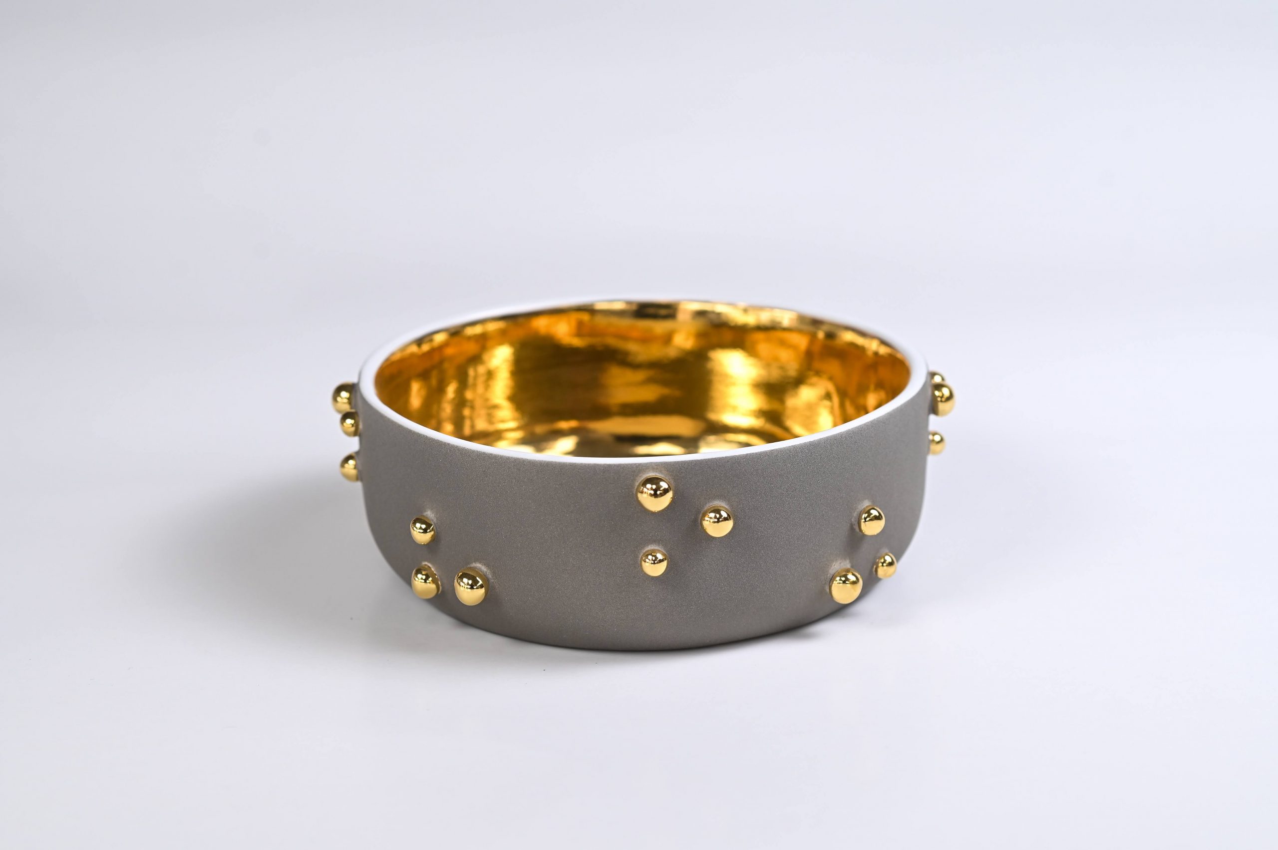 Handcrafted of signature ultra matte glazes on stoneware or porcelain with 22k gold details.